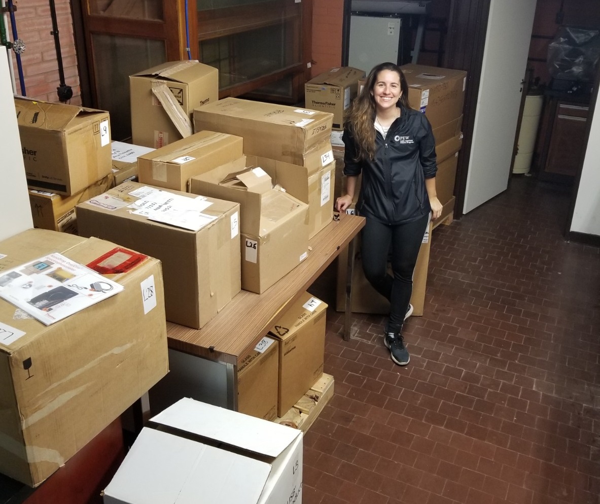 Ana en 2020, recién llegada al país, rodeada con las cajas sin desarmar que darían forma a su nuevo laboratorio del INIQUIMAE.